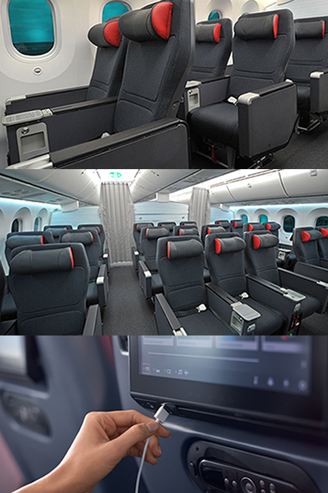 - Comforts at your seat include a personal 8.9-inch touchscreen entertainment system.